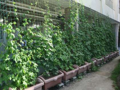 ゴーヤのグリーンカーテンも1階部分は大分と出来上がってきました。毎日、管理作業員さんが水やりなどの手入れを行っています。そのおかげで、ゴーヤの葉も大きく成長し、こづるもたくさん出てきました。2階まで成長してくれればと思っています。