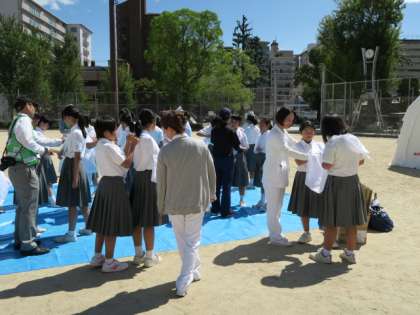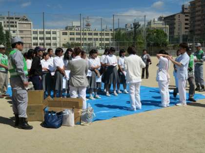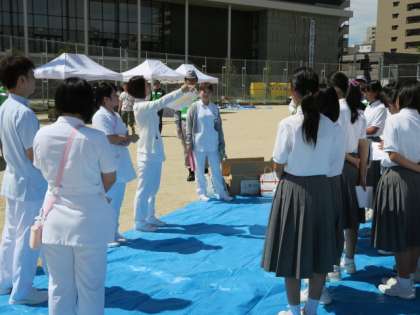 三角巾での応急処置の仕方を、看護師の方から学び、実際に三角巾で応急処置を行いました。