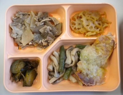 11月21日(金)の中学校給食です。メニューは、鶏肉のねぎ塩焼き、三度豆としめじぞえ、干しずいきの炒め煮、れんこんの炒めもの、きゅうりの風味漬け、米飯、牛乳です。