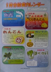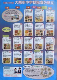 給食配膳室と職員室前に掲示しています。季節のメニューや、風邪の予防を考慮したメニューなど工夫されています。