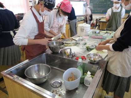 見事な包丁さばきで、ごぼうのささがきをしています。上手な生徒は、ごぼうが鉛筆の先のようになっています。