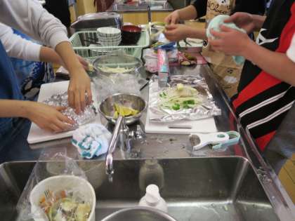 さつま汁の次に、鱈のホイル焼きを調理しています。アルミホイルに、たまねぎ、ピーマン、えのき、鱈をのせ、その上にバターをのせ包みます。後はフライパンで蒸し焼きしていきます。