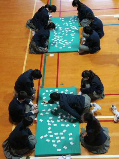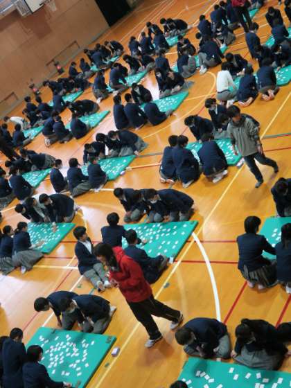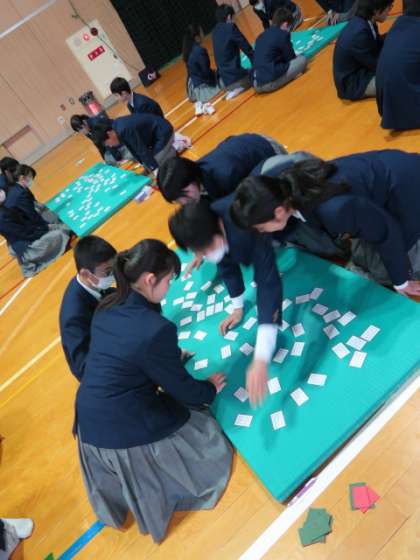 1年生の百人一首大会と比べると、2年生は体が一回り大きく学年全員が並ぶと体育館が小さく感じられました。