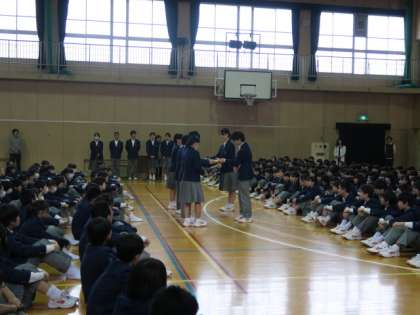 はじめに、2年生代表が感謝の気持ちを込め「卒業生に送る言葉」を、続いて、「在校生に贈る言葉」を3年生代表から述べました。