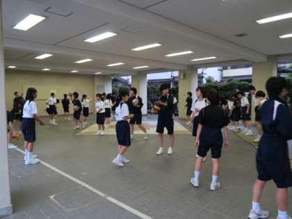 バレーボール部はピロティーで練習を行っています。先輩と混じって練習に励んでいます。