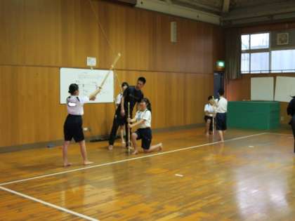 剣道部は、今日は挌技室で練習を行っています。顧問の先生が、1年生に稽古をしています。