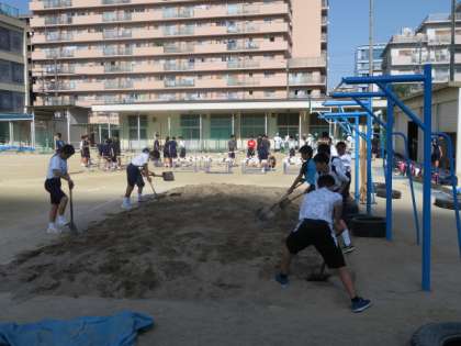 その砂場の整備を、放課後、陸上部の部員たちが行ってくれました。ありがとうございます。