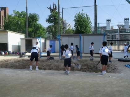 業者の方に、トラックで砂を砂場に入れていただきましたが、整備は学校で行わなくてはなりません。