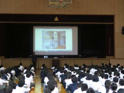 1年生は体育館で行いました。海洋センターの施設を映像に映しながら、どのような場所に行くのかを、目と耳で事前学習を行いました。