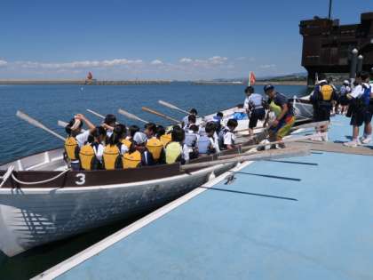 カッターに乗り、櫂の漕ぎ方を聞き大阪湾へ出ました。