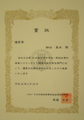 2月23日(日)、大阪音楽大学 ザ・カレッジ・オペラハウスで実施された、第18回全日本中学生・高校生管打楽器ソロコンテスト関西大会において、優秀賞を受賞いたしました。