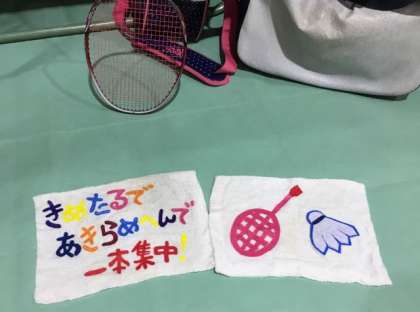 右のの写真は、スリップ防止のためシューズの接地面を湿らせる濡れタオル。軽快なフットワーク維持と、気持ちを切り替えてゲームに臨みます。合言葉「きめたるで、あきらめへんで、一本集中。」です。部員一人一人の思いが勝利に繋がりました。