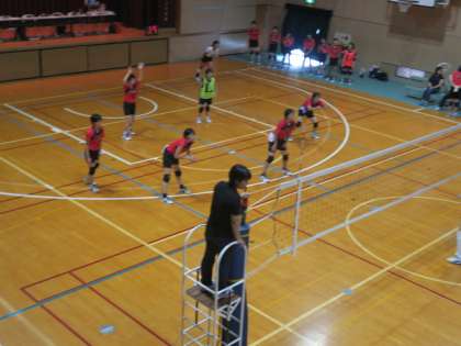 蒲生中は、第1試合、第2試合とも勝利し、第3戦目はリーグ優勝をかけての城陽中との対戦です。第1セットは蒲生中が優位に試合をすすめました。しかし、セットポイントのところで追いつかれ、デュースになりましたが、蒲生中の粘り強さを発揮し第1セットを勝ち取りました。