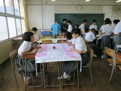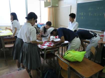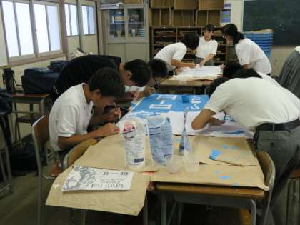 1、2年生は学年の学習室、3年生は美術室で、学級ごとに集まり製作しています。部活動もあるので交代で製作を行っている学級もあります。