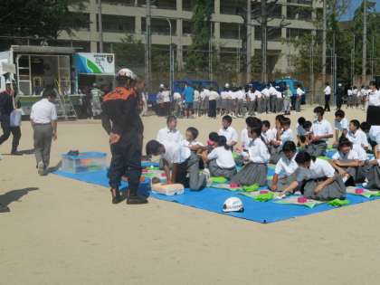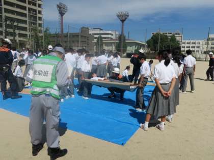 1年生は、毎年城東区の防災訓練に参加しています。2限目に蒲生グランドで、地域防災リーダー、病院、消防署、城東区役所などの地域関係機関の方々とともに防災訓練を行いました。