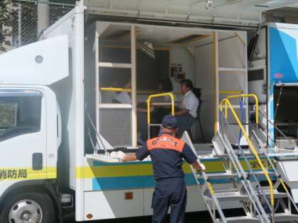 1年生たちは、消防車や病院の看護師の方たちの指導のもと、消火、応急担架などの実動訓練と、起震車による地震体験や煙中体験を行いました。初めての訓練、体験でしたがどの生徒の真剣に取組んでいました。