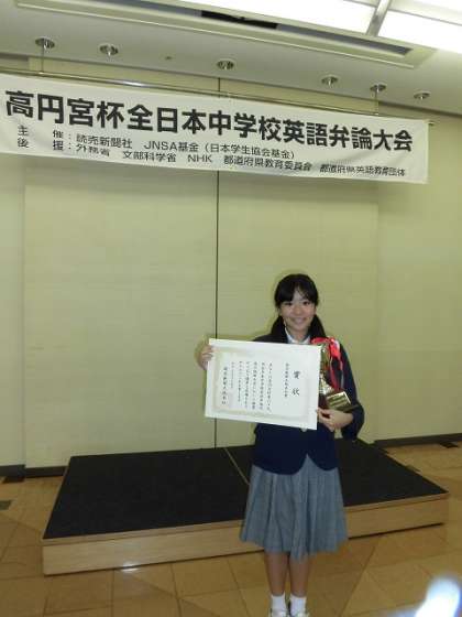 10月4日(水)、高円宮杯第69回全日本中学校英語弁論大会・大阪府大会が読売本社ビルで開催されました。大阪府下から27校の27人が参加し、入賞者10名が選ばれました。発表のテーマは自由で、英語力や表現態度などを審査されました。