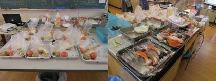 1年生は家庭科で調理実習を行っています。今日の2,3時間目は4組が行いました。献立は鮭のムニエルとトマトの野菜スープ、ミネストローネです。