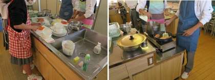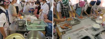 準備がととのった班から、フライパンで鮭のムニエル、鍋でミネストローフの調理を始めました。どの班も手際よく調理を進めていました。