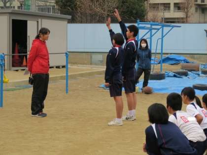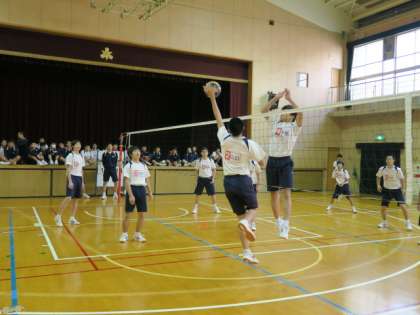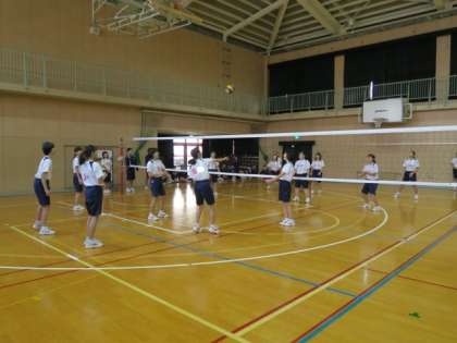 球技は、体育館では男女ともバレーボールを、運動場では男子がサッカー、女子がポートボールをクラス対抗で行いました。