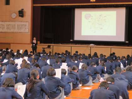 本日の6限目に2年生は体育館において進路についての学習を行いました。大阪市教育委員会に勤務している先生を講師に、大阪市立高校についてのお話しをいただきました。