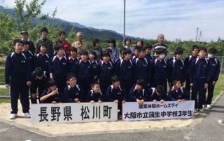 写真は、長野県松川町への農業体験ホームステイでの入村式の記念写真です。松川町みらいでは、9軒の農家さんに受け入れていただきました。