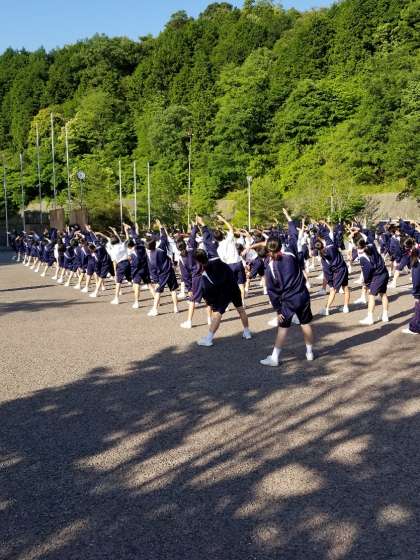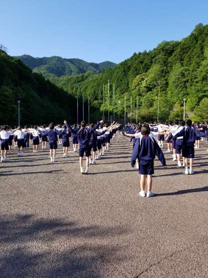 先生からの注意事項のお話を聞き、元気いっぱいラジオ体操をしている様子です。