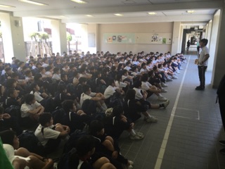 到着後、ピロティ—にて集合し学年集会を行ないました。