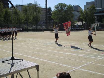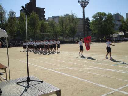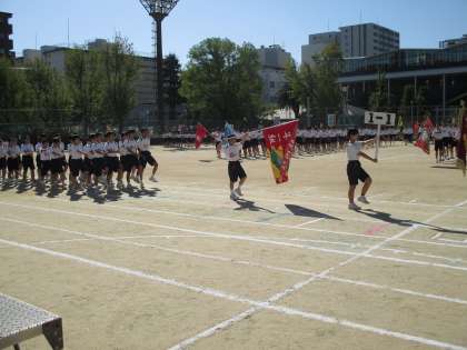 生徒会役員に続いて、3年1組の体育委員を先頭に、3年生、2年生、1年生の順に、入場行進している様子です。