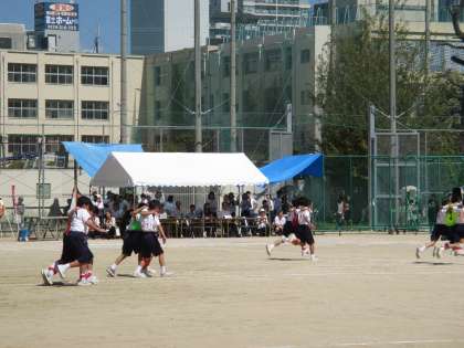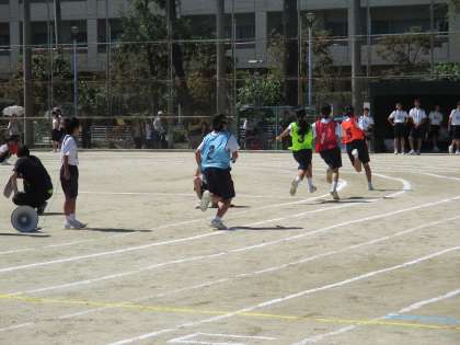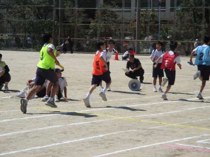 3人4脚とスウェーデンリレーの様子です。3人4脚は、3人の呼吸を合わせて走るのが難しくもあり、楽しそうです。スウェーデンリレーは、後の走者になるほど、走る距離が伸びるリレーです。白熱した戦いでした。