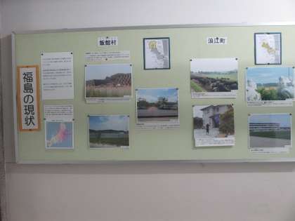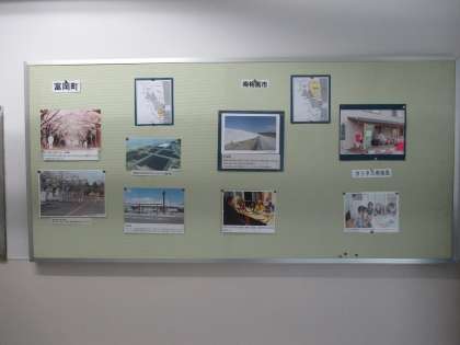 1階ピロティの手前側の廊下の壁面に、教職員有志の写真や雑誌に掲載された記事等の作品が掲示されています。