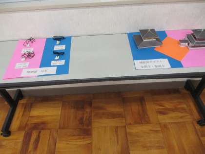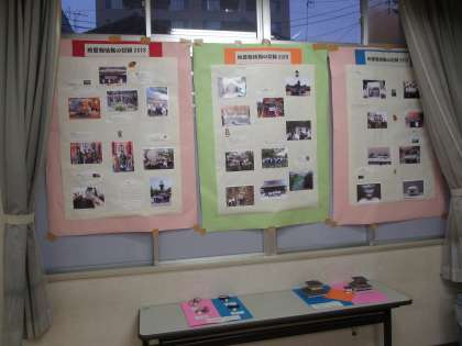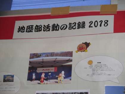 続いて、地理歴史研究部の作品です。今年度、現在まで足を踏み入れた博物館や名勝地などの足跡を模造紙で掲示されて、またクラフト作品も展示しています。