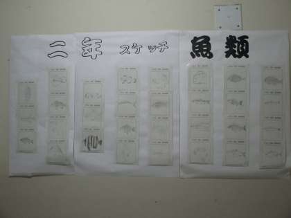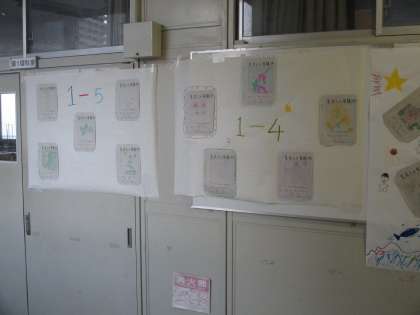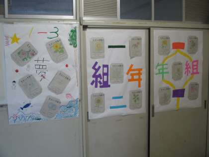 校舎の3階にのぼり、理科室前の廊下の壁面に、1・2年生の理科の作品を掲示しています。左側と真ん中の写真が1年生の理科の作品、右側が2年生の理科の作品です。