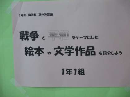 写真は、1年生の国語科の作品です。戦争と平和をテーマにした絵本や文学作品を紹介する作品です。
