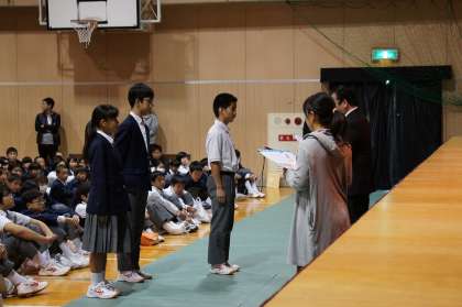 各クラスで、学級旗をデザインした代表者が、表彰されています。
