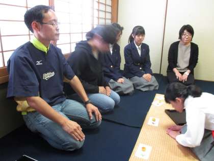1・2年生の茶道部員が、初々しい所作で、和菓子を運び、お抹茶をたてました。参加した保護者の方も生徒も教員も、おいしくいただきました!