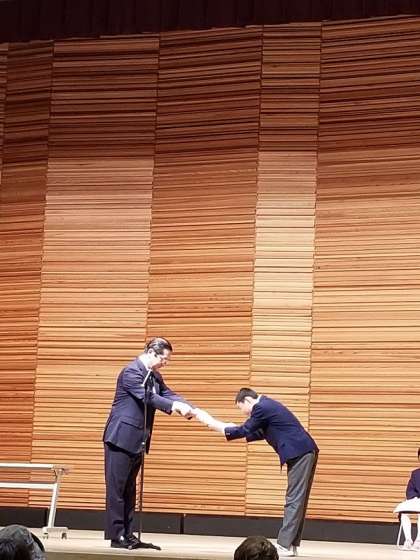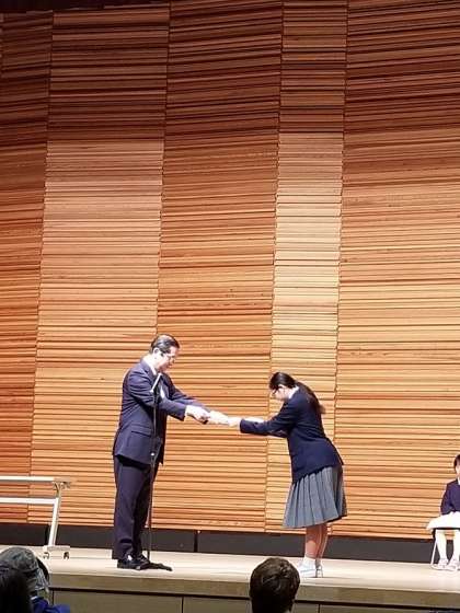 本校からは、1年生の桑原大昇くん(テコンドー)、2年生の寺西真耶さん(少林寺拳法)、3年生の畑すみれさん(高円宮杯英語弁論大会)、3年生の盛岡天来さん(陸上・女子砲丸投げ)が表彰されました。