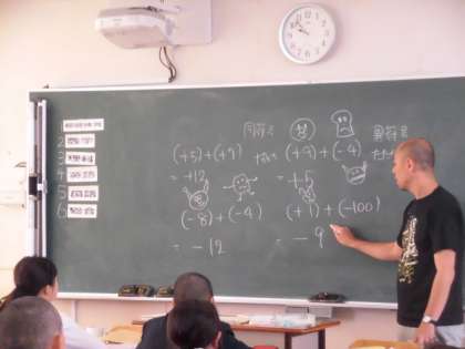 生徒の皆さんが理解しやすいように「アンパンマン」のキャラクターを描き、同符号は見方どうし、異符号は敵との対決いう表現で説明していました。