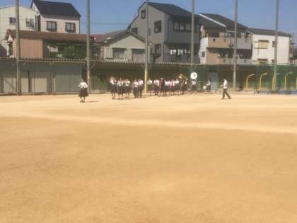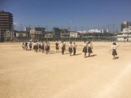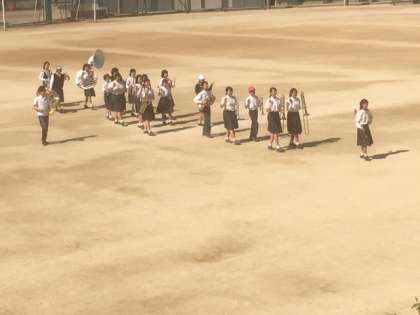11日、午後からグランドで吹奏楽部が万博公園で明日行われるブラスエキスポ2019の行進練習をしていました。暑い中頑張ってます。
