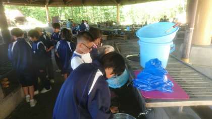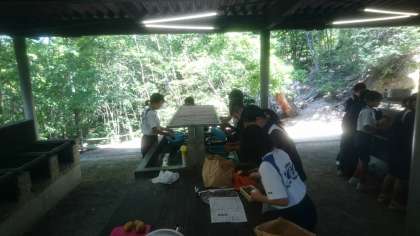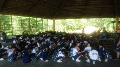 野外炊飯場に到着しました。これから飯盒炊飯が始まります。昼食のメニューは、定番のカレーライスです。美味しいカレーを作りましょう。