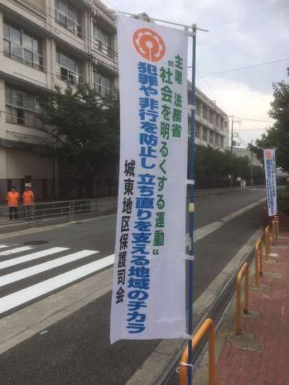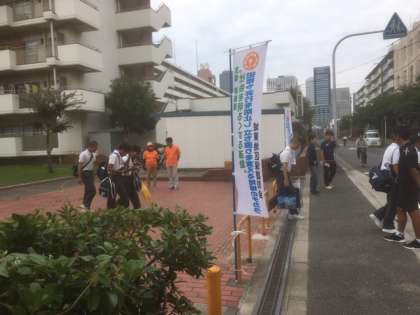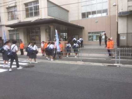 27日、毎学期の始めに、城東区保護司会の皆さまが、生徒への声掛けあいさつに来ていただいています。登校してくる生徒一人ひとりに「おはよう」と声掛けをしていただいています。