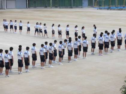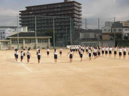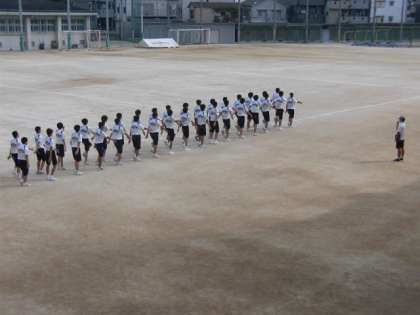 体育の時間にラジオ体操や行進練習を行っています。