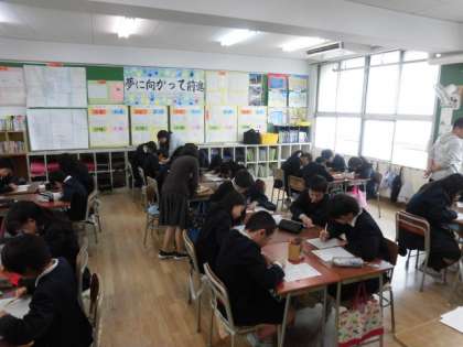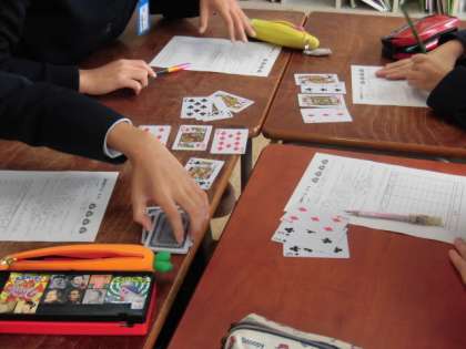 内容は数学です。正の数・負の数の黒字・赤字ゲームを、トランプを使い行いました。その後、俵算をしました。