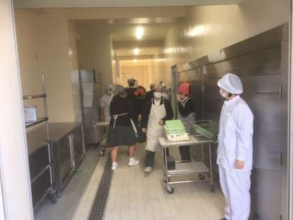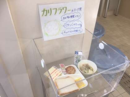 二学期の給食も本日が最後になりました。今日のメニューは、とうふハンバーグ、カリフラワーのスープ煮、スライスチーズ、アプリコットジャム、牛乳でした。手を洗い、給食棟に入り、給食を持って行きます。
