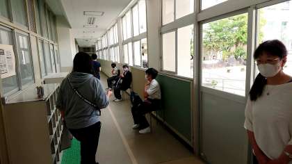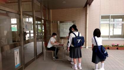 正門では、手のアルコール消毒と家庭で検温した結果の報告を行っています。忘れてしまった生徒は、保健室前で距離をとって検温しています。