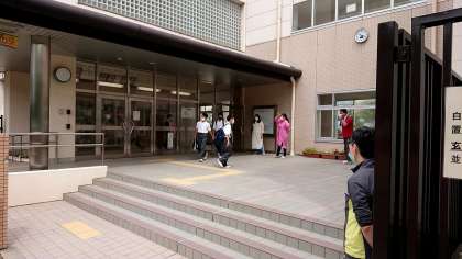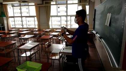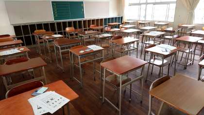 前のグループの下校と同時に、教室では次のグループが登校するための準備となります。机や椅子などの消毒を済ませて、座席にプリントが並べられています。