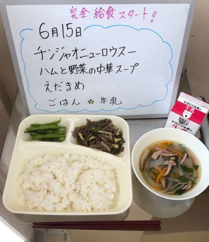 さて、今日のおかずは、「チンジャオニューロウスー、ハムと野菜の中華スープ、えだまめ、ご飯、牛乳」でした。チンジャオニューロウスーの『ニュー』には、牛肉という意味がありますが、牛肉とピーマン、たけのこなどを炒め、オイスターソースで味つけ。中華スープには野菜の旨みたっぷりでした。