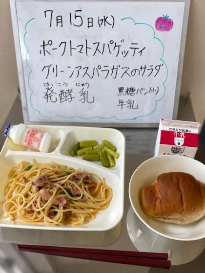 今日の給食は、『ポークトマトスパゲッティ グリーンアスパラガスのサラダ 発酵乳 黒糖パン(1/2) 牛乳』でした。