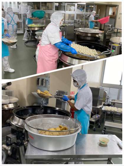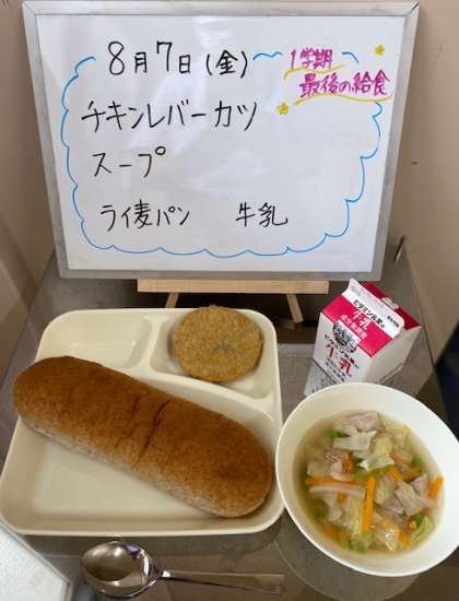 いつもより遅い終業式の今日、給食も最終日。暑い中での作業を考慮し、今日はメニューも一品少なくなっています。でも栄養はバッチリ!チキンレバーカツは7月に登場したものより大きめのものを取り入れ、スープはより具沢山。野菜の旨味たっぷりです。※チキンレバーカツは冷凍で届いたものを揚げるのですが、鉄分たっぷりでカレー風味。レバーを感じさせない優れた製品です。