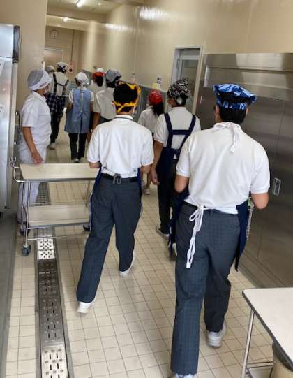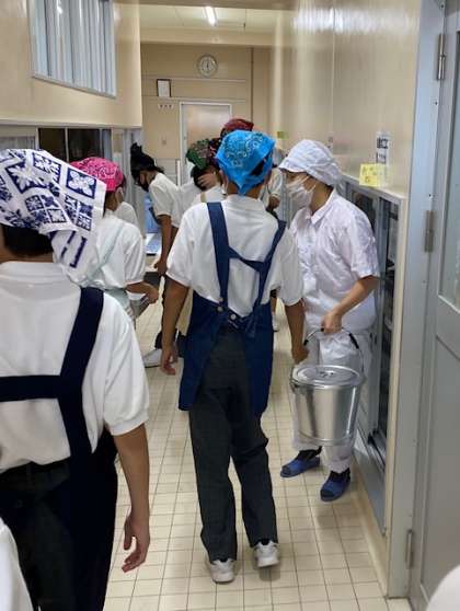いつも給食室では当番の生徒に給食を手渡しています。暑さ厳しい時ですが、安全に運んで、しっかり食べてきてね、と願いを込めて手渡しています。